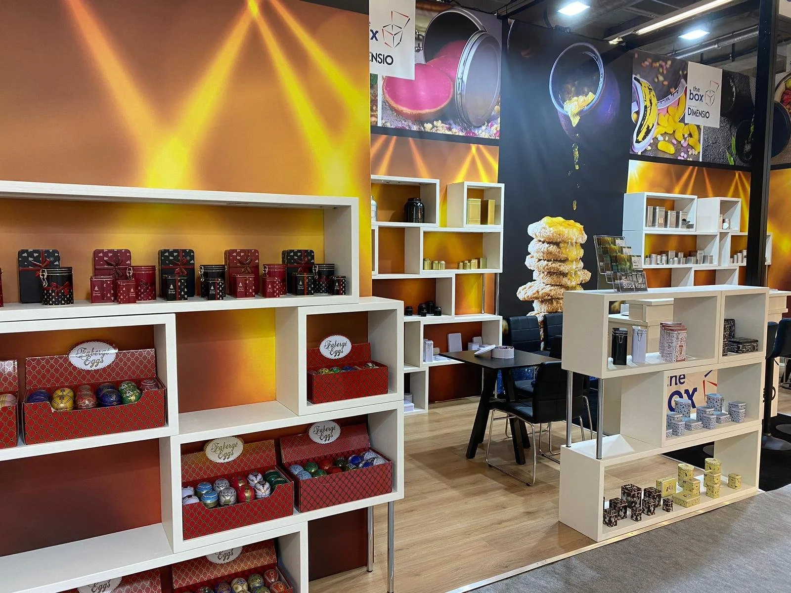 Our client in this exhibition design wanted to showcase their more bespoke merchandise, which included various options for customizing gift packaging.